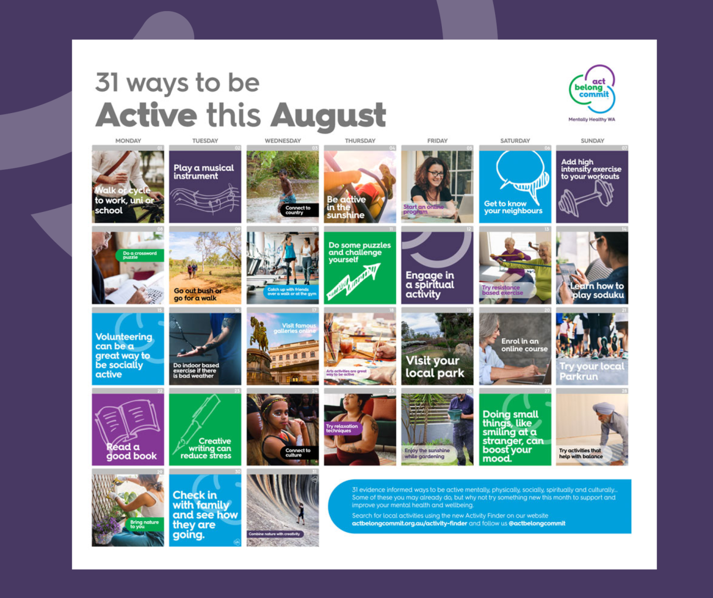 Check out the Active August calendar to get inspired by the 31 daily tips and find things suitable to you. We also have a version for children and families which we promote through the Mentally Healthy Schools program.